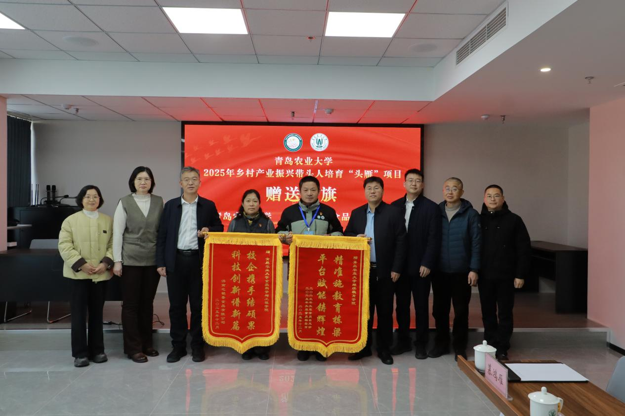 活动中,校企双方围绕乡村产业振兴带头人培育、成果落地转化等内容展开座谈,并就深化产教融合、推动技术与产业对接的具体路径进行了深入交流。座谈结束后,济南屹铠香食品有限公司向青岛农业大学赠送锦旗,以表达对校方支持与合作的感谢。