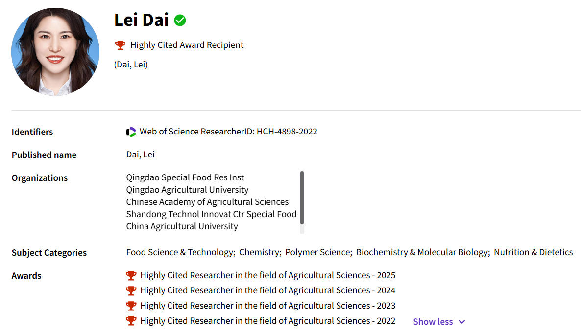 11月12日,科睿唯安正式发布2025年度“全球高被引科学家”名单,英国365集团,365英国官方代蕾教授榜上有名,自2022年以来连续第四年获此殊荣。全国食品领域共有35位学者入选2025年度“全球高被引科学家”名单。