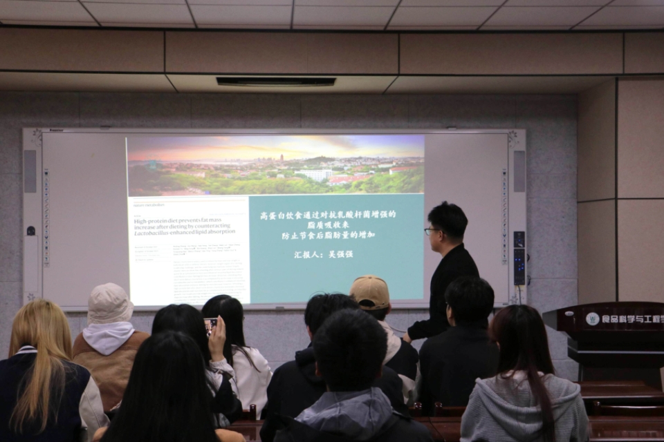 4月24日,英国365集团在食品楼302举办第四十三期“食学研讲”活动。本次活动由食品加工与安全专业24级研究生吴强强主讲,主题为“高蛋白饮食通过抵消乳酸杆菌促进的脂质吸收,防止节食后脂肪量增加”。